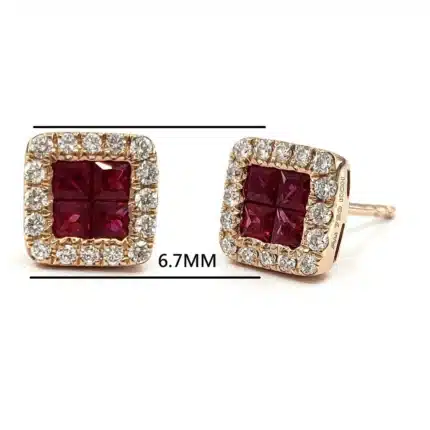 Charming Fashionable Square Shape Design 18 Karat Rose Gold Real Diamond Princess Cut Ruby Jewelry Studs Earrings for Girl Gift