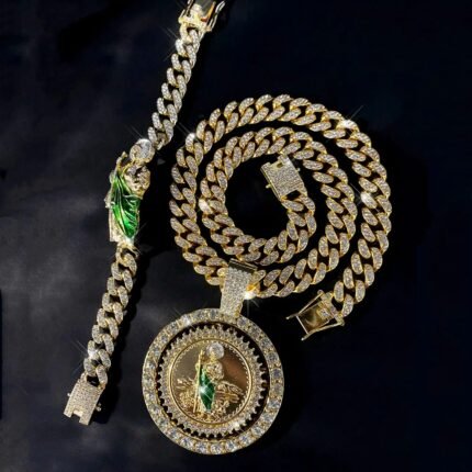 Hip Hop Cuban Link Chain Necklace with Saint Jude Pendant and Bracelet Fashion Rotatable Jewelry Set Party and Daily Decor
