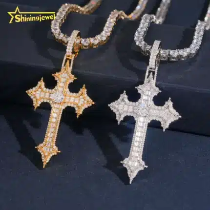 Key attributes Jewelry Main Material:925 Sterling Silver Min Stone:VVS D Moissanite Jewelry Type:Pendants or Charms Style:Hiphop Shape:Cross Inlay technology:Claw Setting