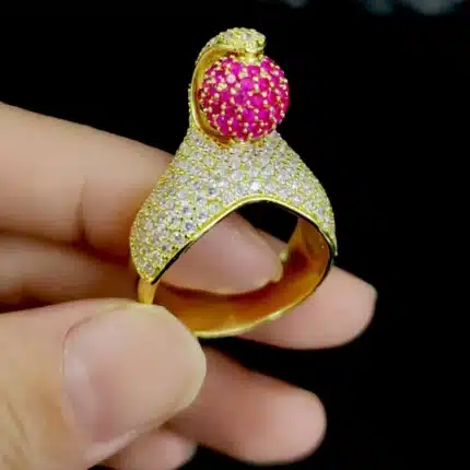 Factory Hot Sell Real Gold Color Plating Iced Out Hip Hop Brass and Bling Zircon Rotatable Red Ball Rings