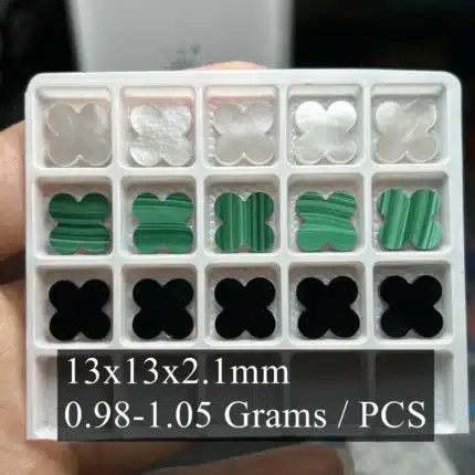 Key attributes Gemstone Type:Natural Treatments Applied:Polished Gemstone Material:Agate, tiger eye, malachite, MOP Gemstone Shape:Four leaf clover Use:For Jewelry Making Model