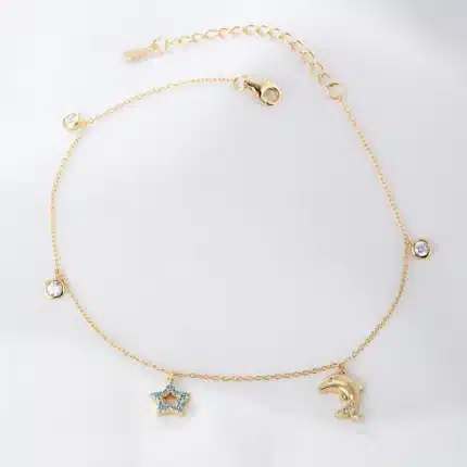 Cute Star Dolphin Psj S925 Sterling Silver 14k 18k Gold Plated Cubic Zircon Charm Summer Beach Anklet Adjustable for Women