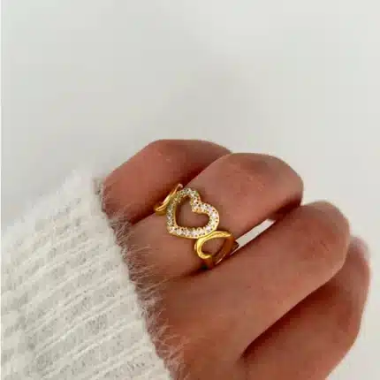 High Quality 18k Gold Plated Hollow Heart to Heart Dainty Zirconia Stainless Steel Ring Fashion Jewelry