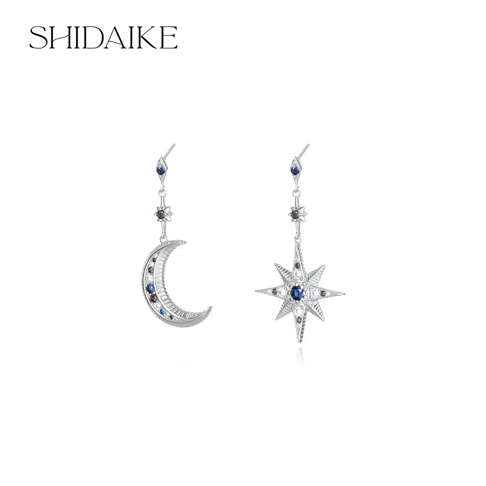 925 Sterling Silver Asymmetric Drop for Women Gold Plated European American Style Colorful Zircon Star Moon Design Party Gift