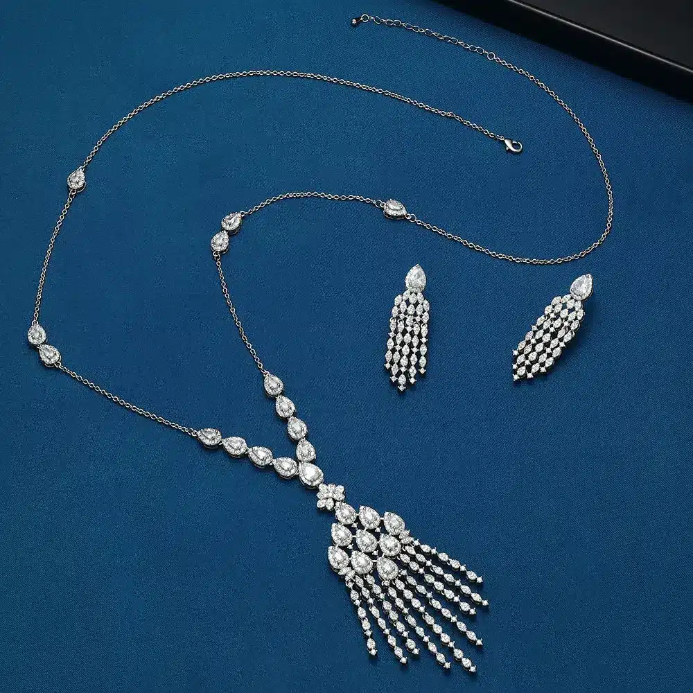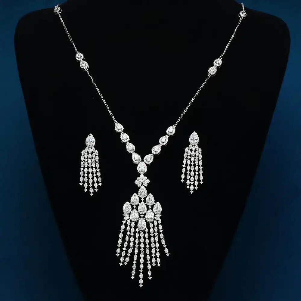 Key attributes Jewelry Main Material:brass Main Stone:ZIRCON Style:Classic Jewelry Type:Jewelry Sets Gender:Women’s Occasion:Anniversary, Engagement, Gift, Wedding, Party Plating:Rhodium Plated, Platinum