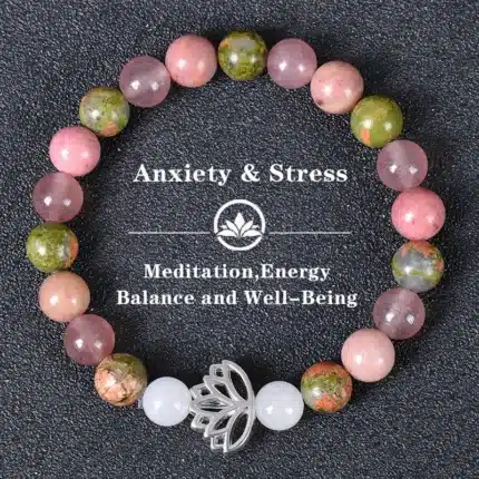 Natural Healing Crystal 8mm Rose Quartz Unakite Sunstone Rhodonite Bead Lotus Charm Bracelet for Women