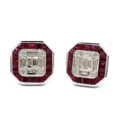 Vintage Square Shape Design Antique Manufacturer 18k White Gold Baguette Diamond Cluster Earrings Stud Ruby Jewelry
