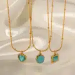 Be the first to review “Classic Gold Plated Square Heart Circular Natural Stone Blue Opal Pendant Necklace Stainless Steel Ball Chain Necklace for Women”