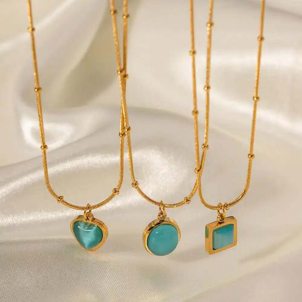 Be the first to review “Classic Gold Plated Square Heart Circular Natural Stone Blue Opal Pendant Necklace Stainless Steel Ball Chain Necklace for Women”