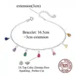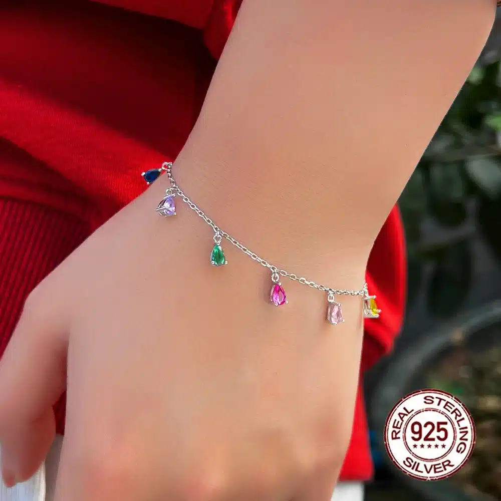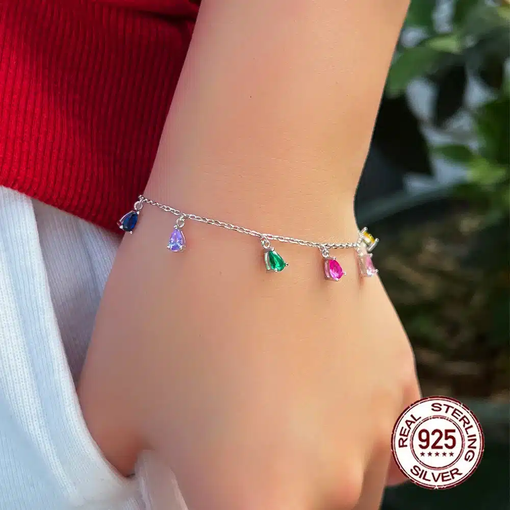Colorful Water Drop Zirconia Boho Chic Adjustable 925 Sterling Silver Chain Bracelet for Women Beach Vacations Music Festivals