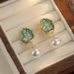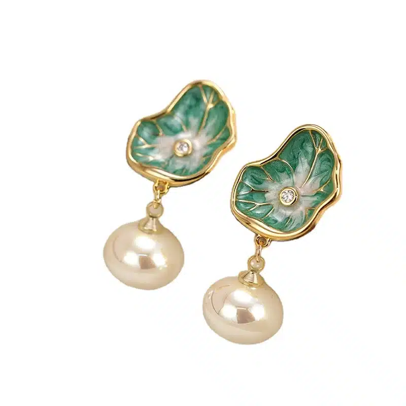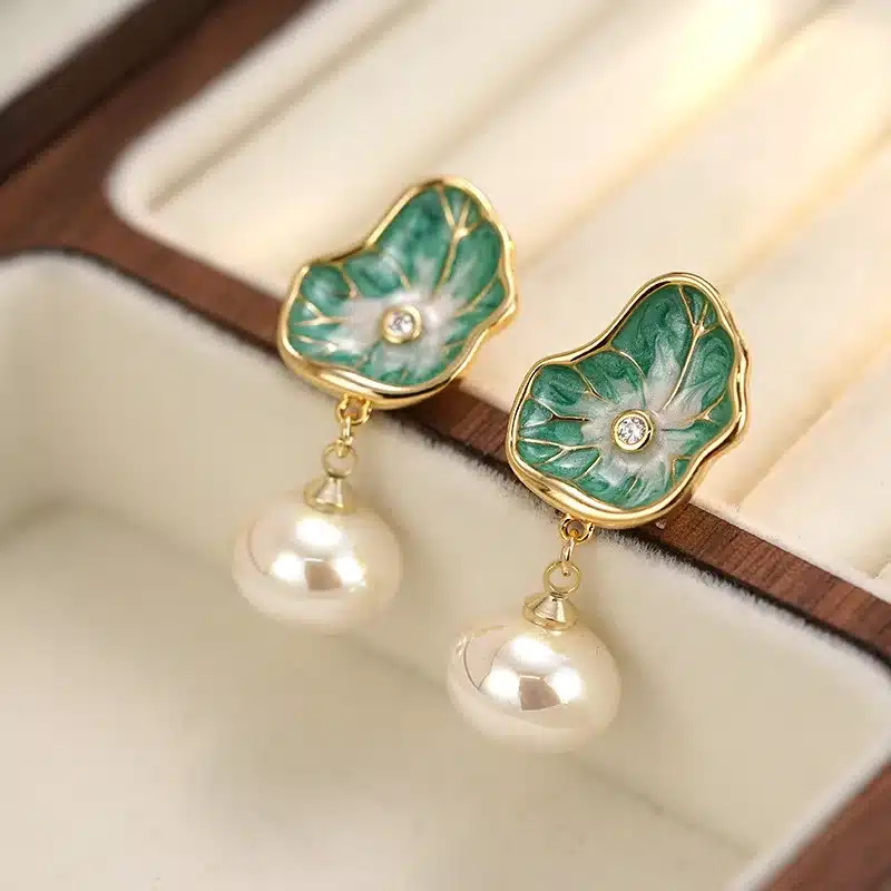 Palace Style Enamel Flower Oil Painting Pearl Earrings Enamel Earrings Silver Brass Earrings