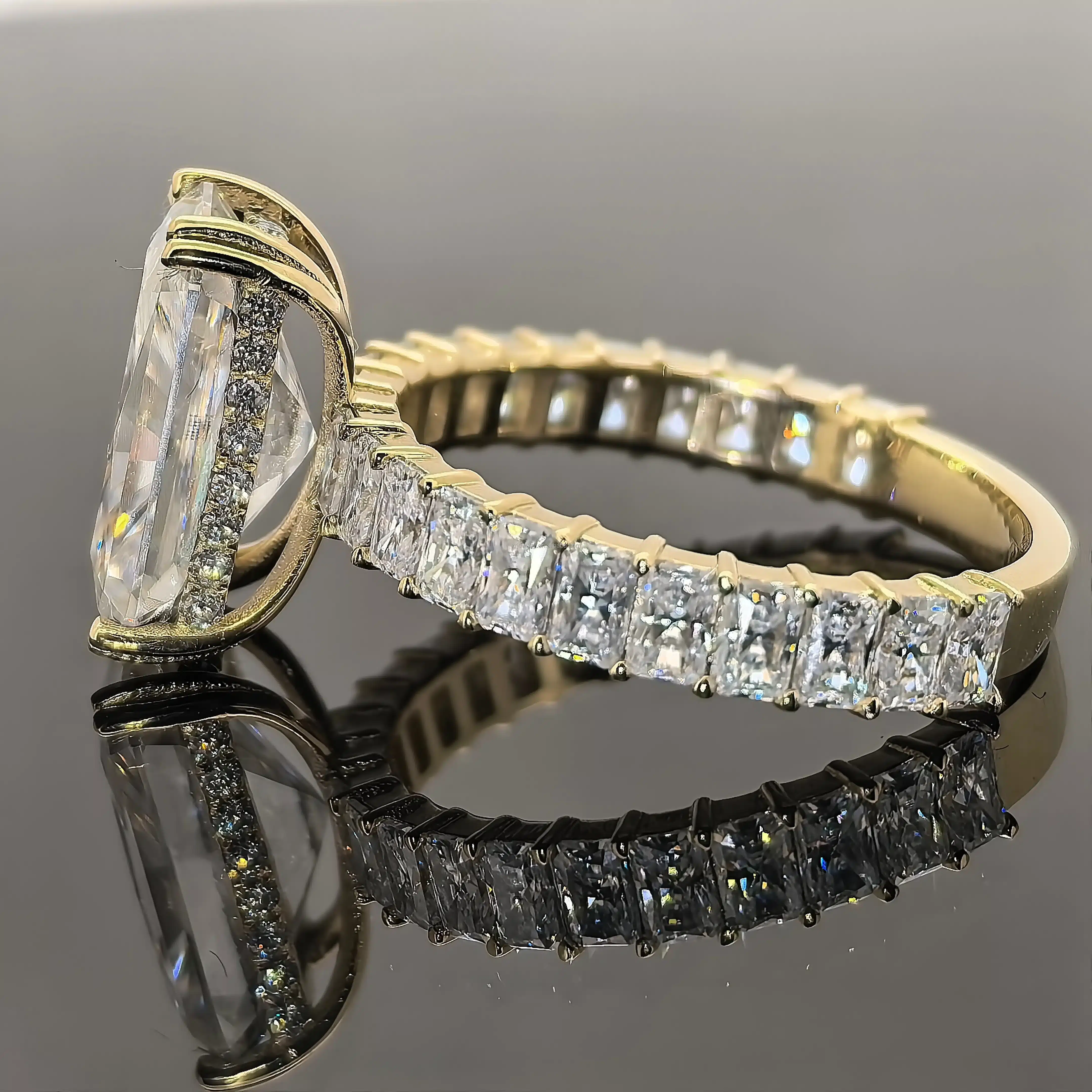 Key attributes Main Stone:Moissanite Plating:18K Solid Yellow Gold Rings Type:Moissanite Rings Inlay technology:Claw Setting Setting Type:Channel setting Style:Romantic Occasion:Anniversary, Engagement,