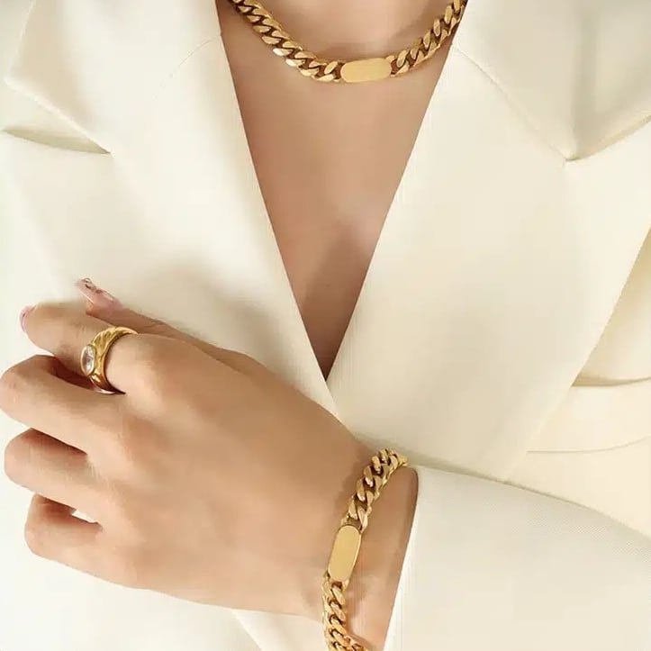 Custom Women’s Stainless Steel Cuban Chain Necklace & Bracelet Set Tarnish-Free Gold Plated Hip Hop Jewelry for Weddings