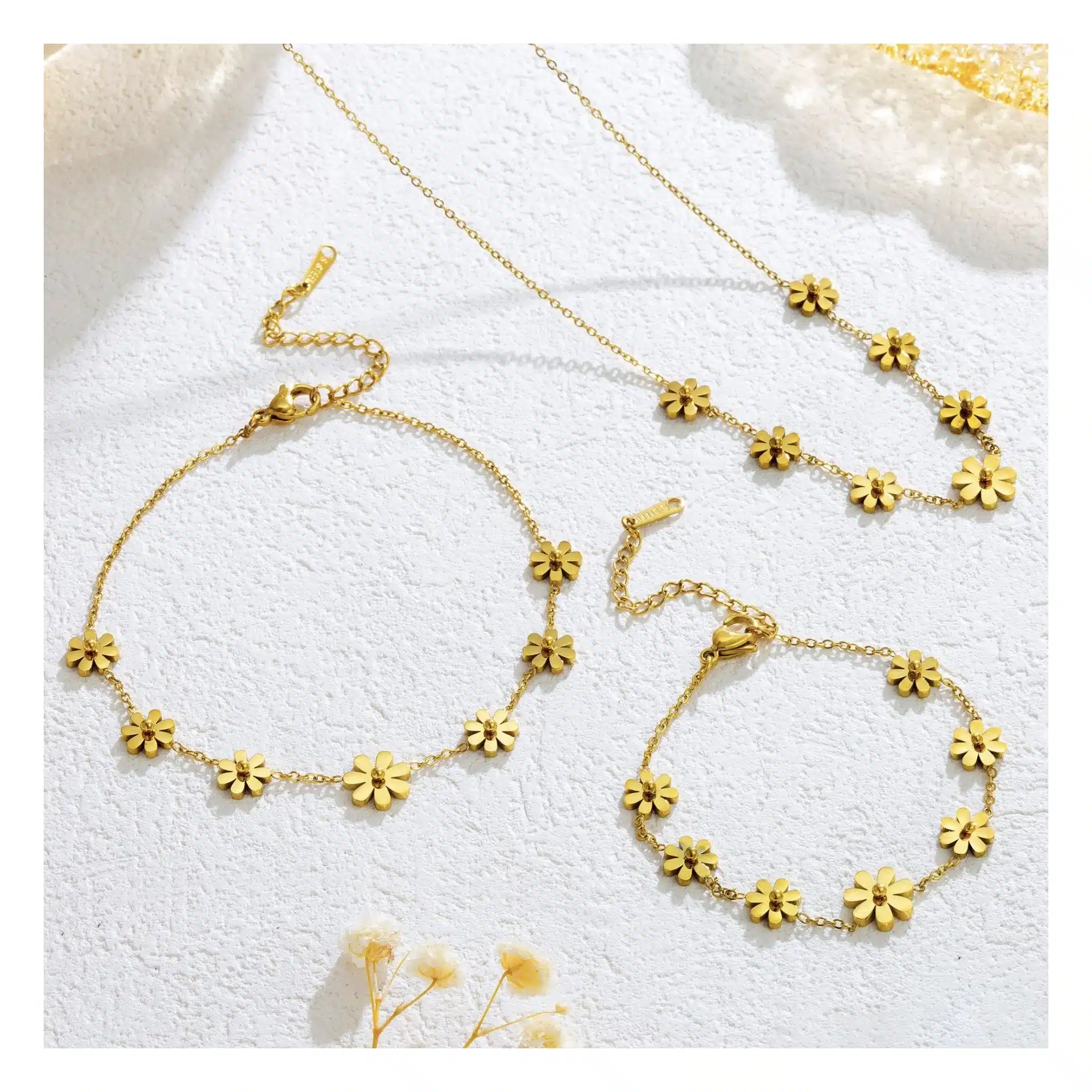 Fashion Exquisite Sunflower Design Necklace Bracelet Anklet Set 18K Gold Titanium Steel Small Daisy Necklace Bracelet Wholesale