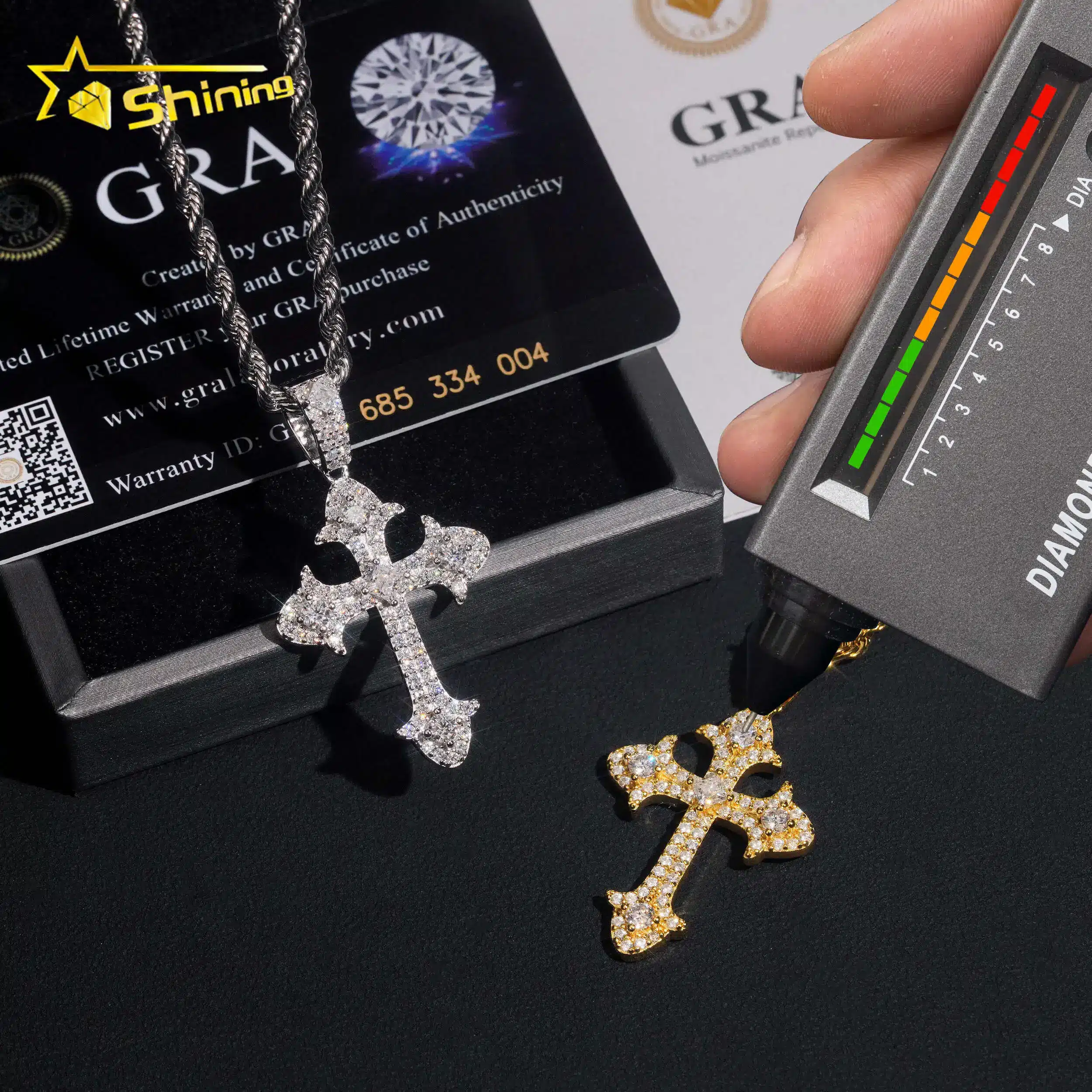 Key attributes Jewelry Main Material:Silver Main Stone:Moissanite Jewelry Type:Pendants or Charms Style:Hiphop Shape:Cross Inlay technology:Claw Setting Pendants or Charms Type:Charm