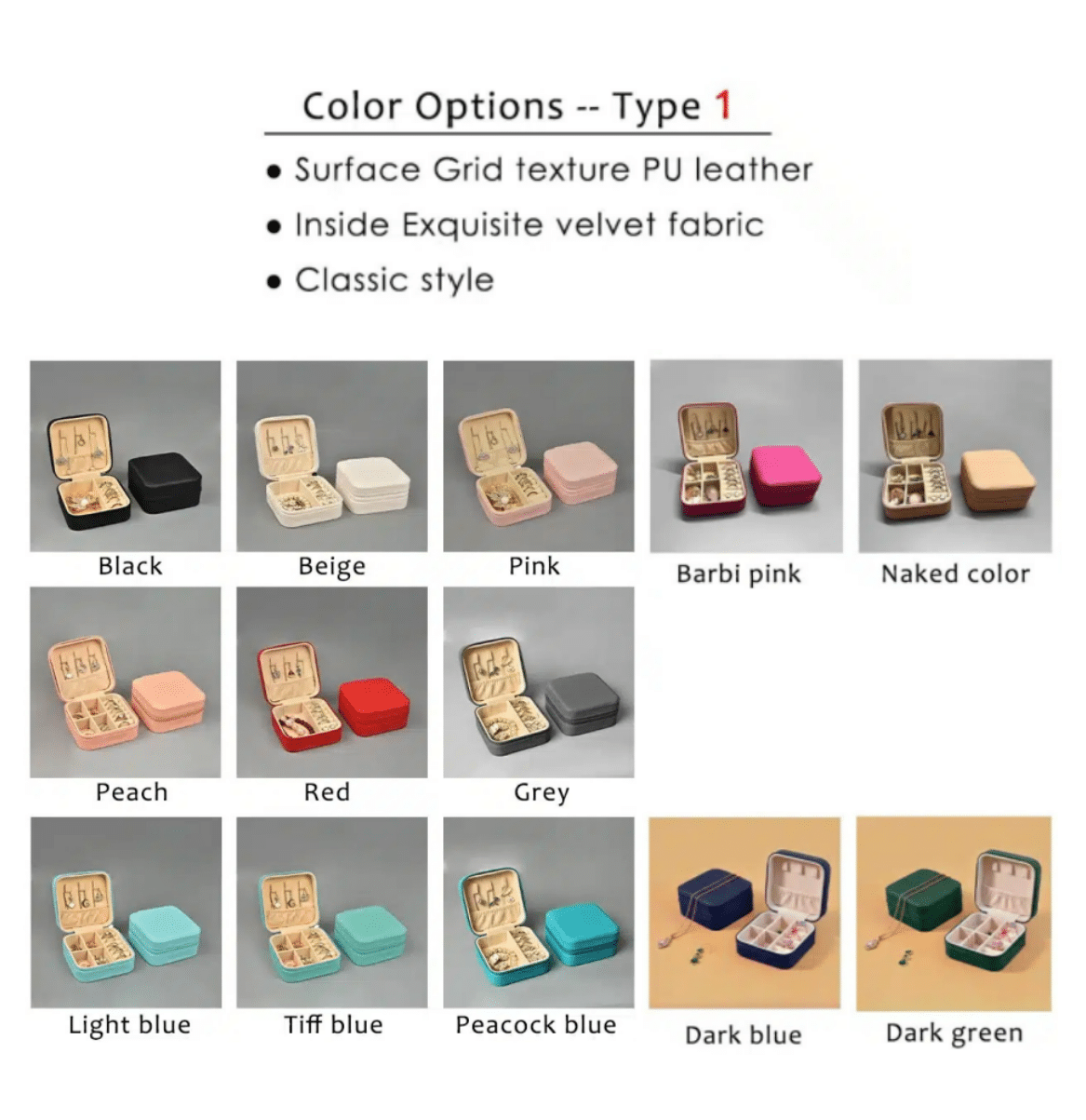 Key attributes Printing Methods:ENGRAVED closure type:Zipper Pattern:Plain Holiday:Christmas Style:Fashionable Application:jewellery packaging Shape:Rectangle Installation:Velvet Material:Velvet Size:16*11*5cm Usage:Jewelry storage