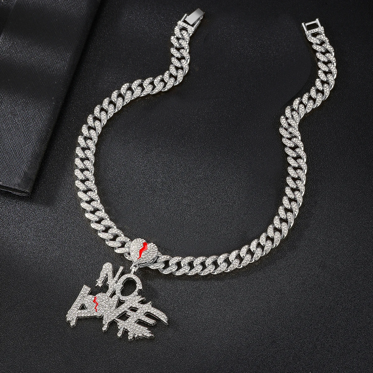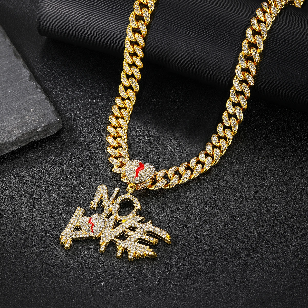 Hip Hop Cuban Chains NO LOVE Necklace Pendants for Men and Women Heart Broke Statement Necklaces Jewelry Iced Out Bling Chain