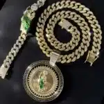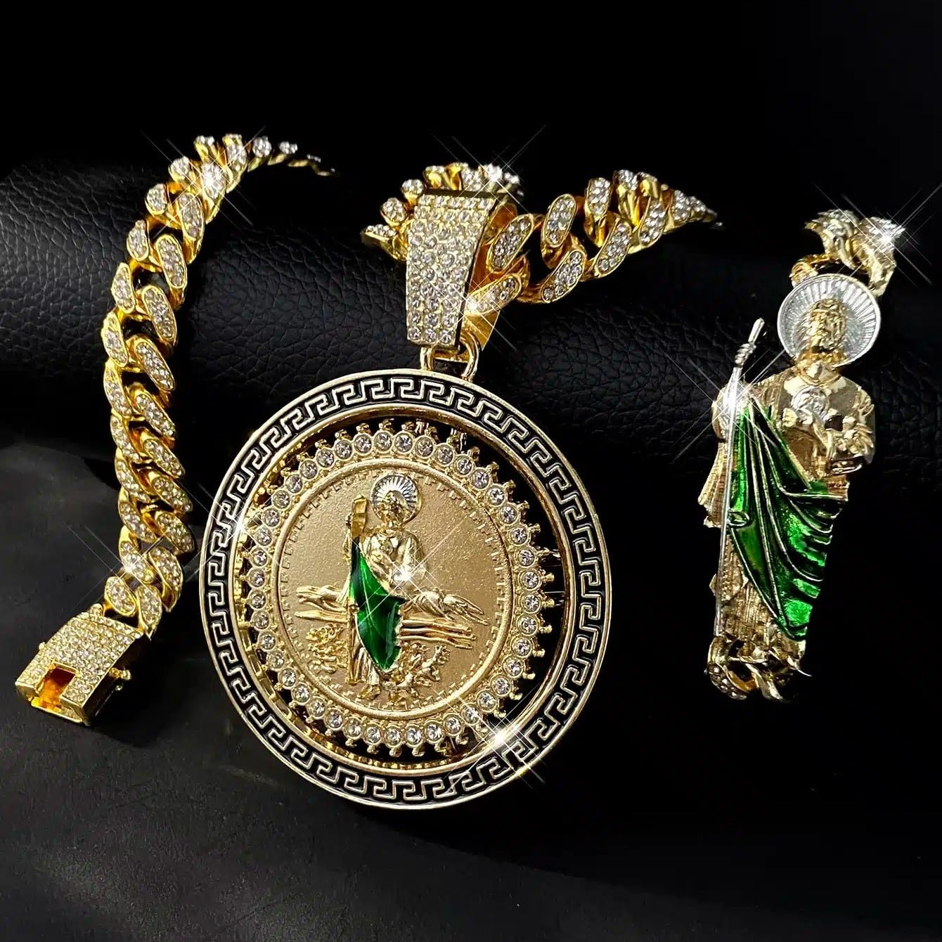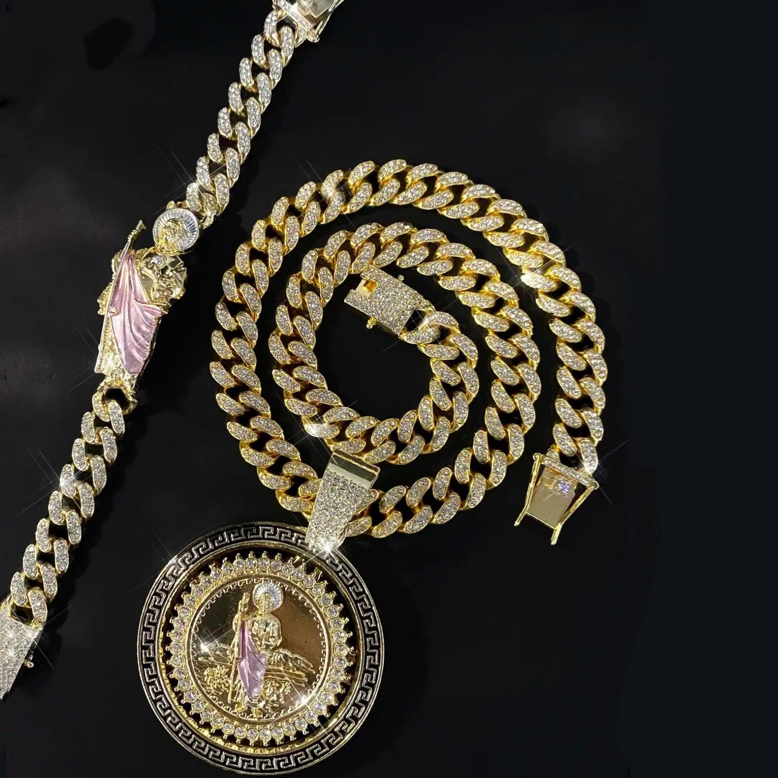 Be the first to review “Hip Hop Cuban Link Chain Necklace with Saint Jude Pendant and Bracelet Fashion Rotatable Jewelry Set Party and Daily Decor” Cancel reply