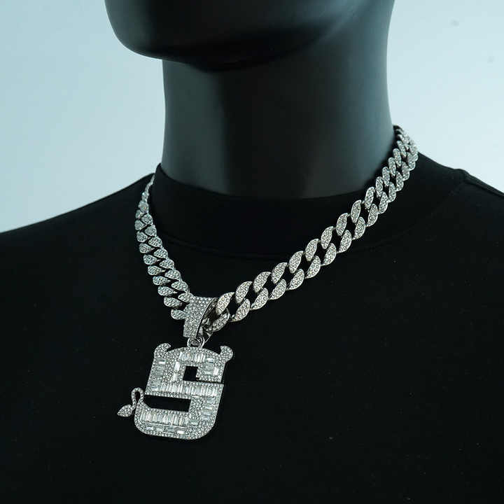 Hip Hop Miami Cuban Chain With Alloy and CZ Rhinestone S Letter Pendant Necklace