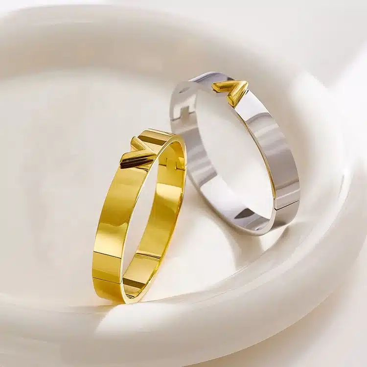 Be the first to review “Hot Sale Fashion Minimalist Stainless Steel Three Dimensional Letter Relief V Shaped 10mm Thick Bangle Bracelet” Cancel reply