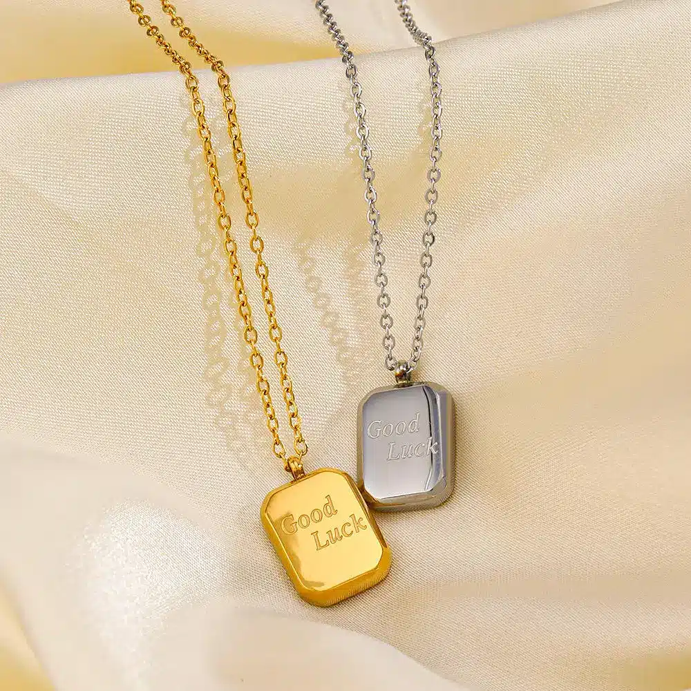 Be the first to review “Hot Selling Jewelry Manufacturer Rectangle Engraved Letter Good Luck Necklace Stainless Steel Jewelry Square Necklace for Women” Cancel reply
