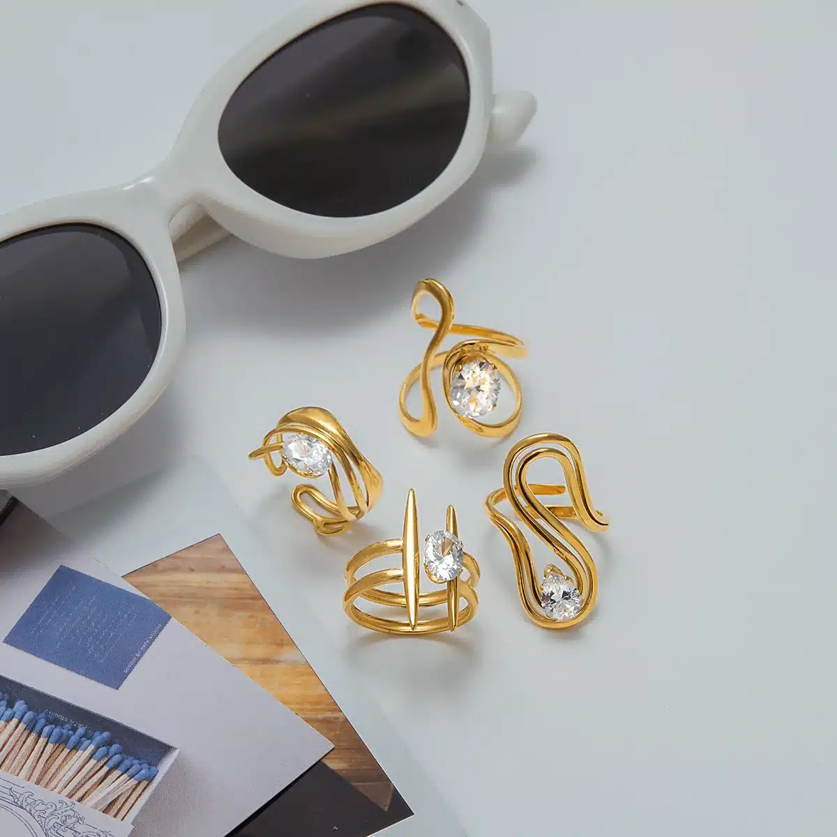 J&D 18K Gold Plate Stainless Steel Rings Modern Minimalist Lines Double-layer Hollow Geometric Zircon Open Ring
