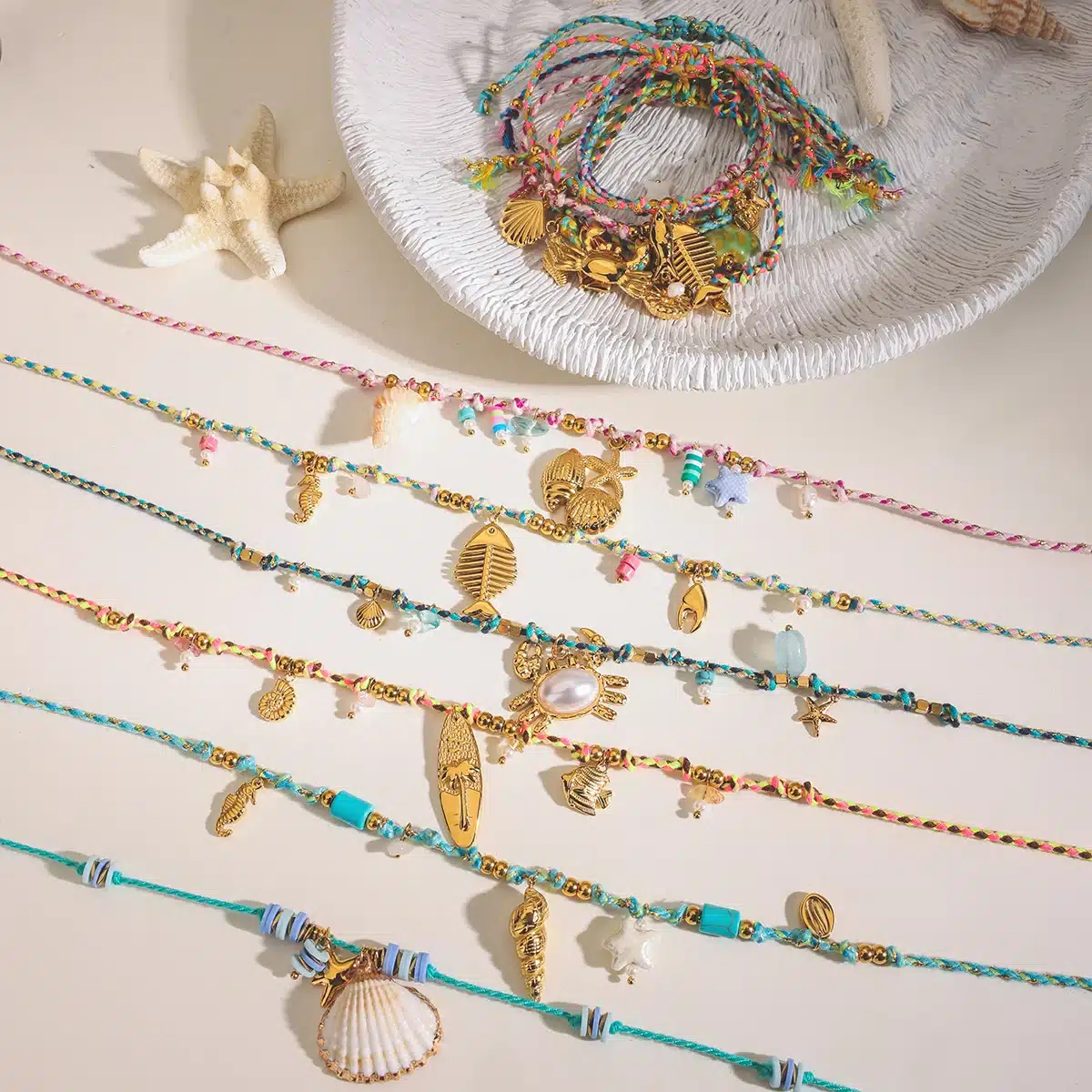 J&D 18K Gold Plated Stainless Steel Summer Beaded Bracelet Colorful String Ocean Charm for Beach Vacation Jewelry