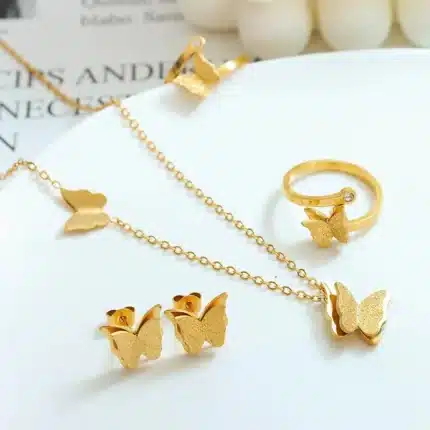 KISSWIFE Fashion Frosted Butterfly Pendant Necklace Earrings Ring Gold Plated Stainless Steel Jewelry Set for Women