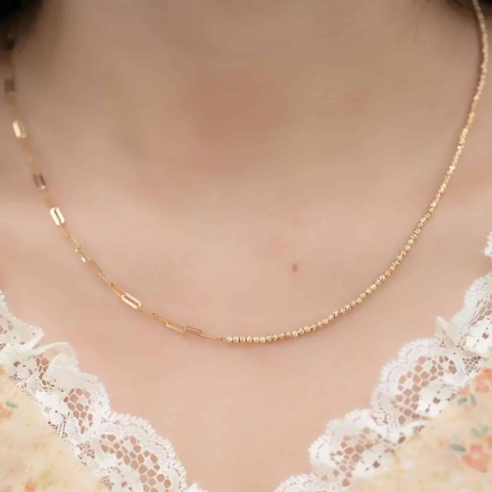 Key attributes Necklaces Type:Chains chain type:chopin chain Gender:Women’s Jewelry Type:Necklaces Jewelry Main Material:18K Solid Gold Style:Trendy Material Type:Rose Gold, White