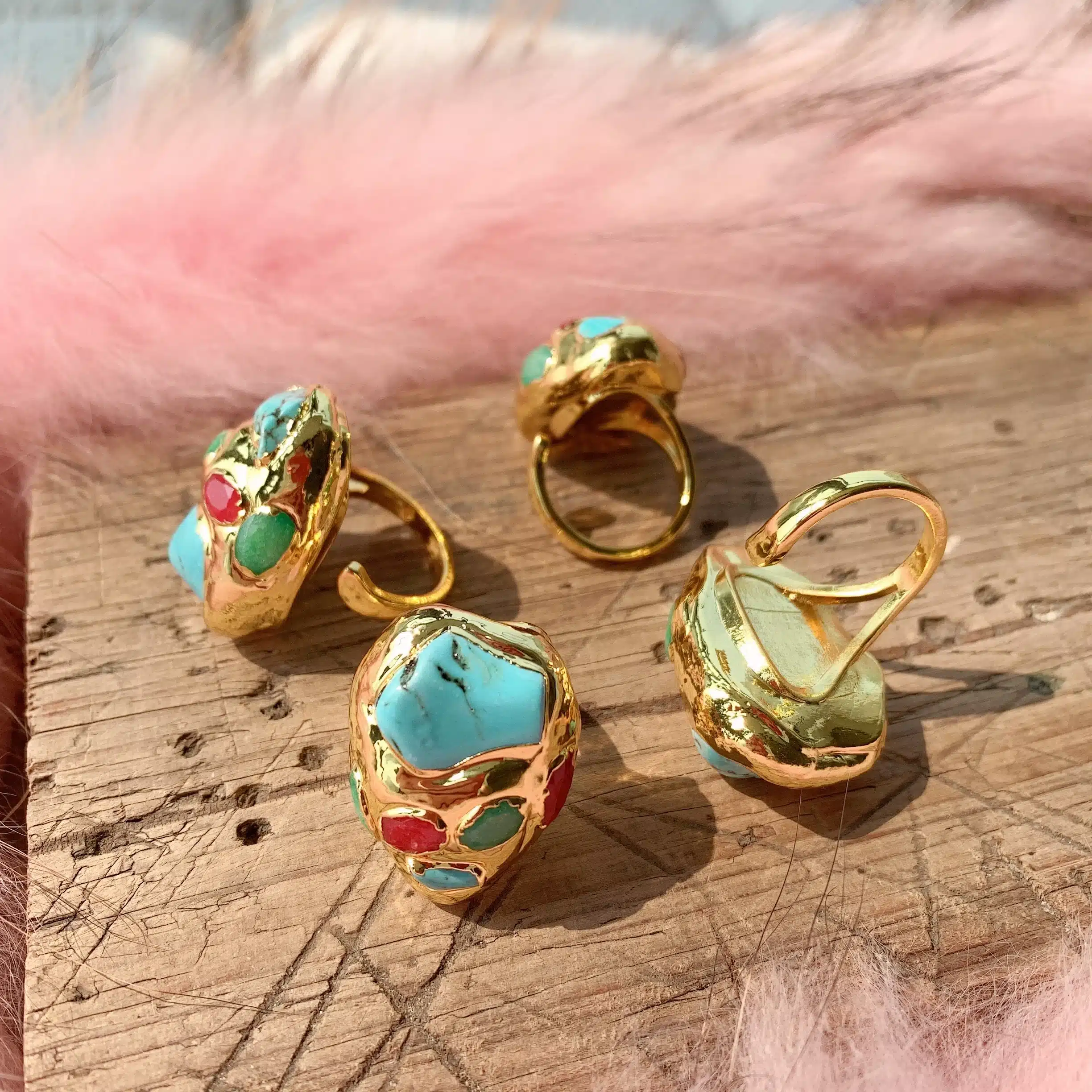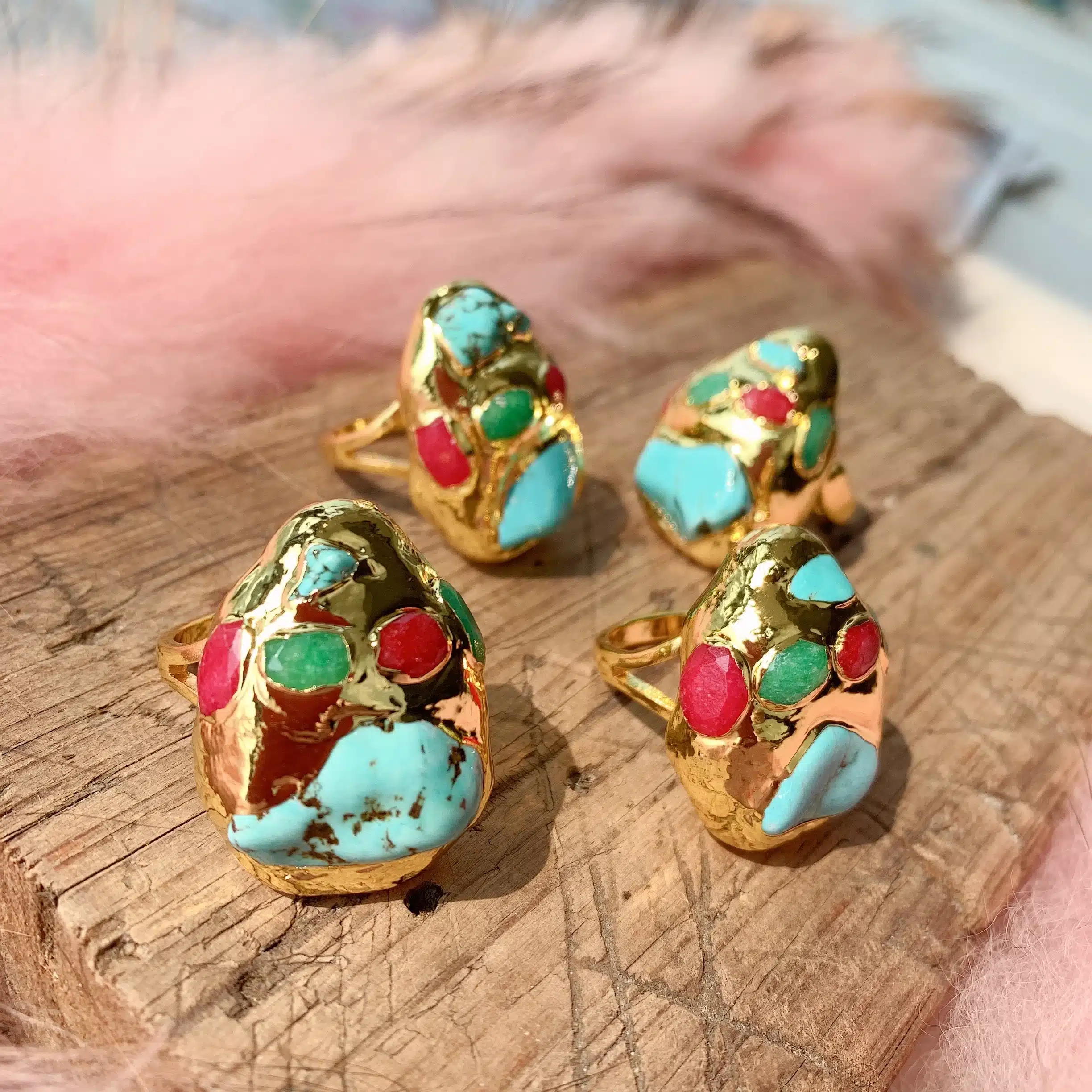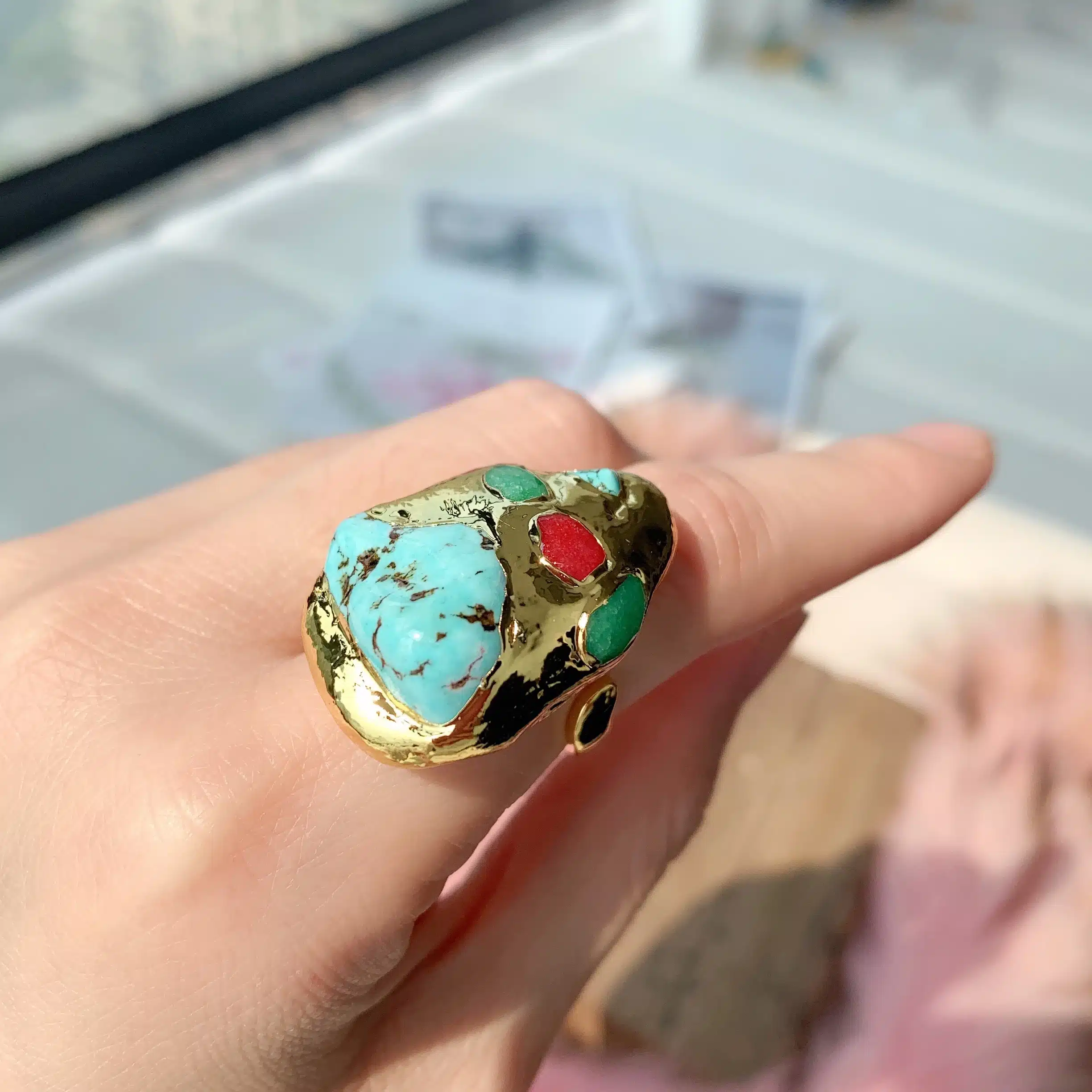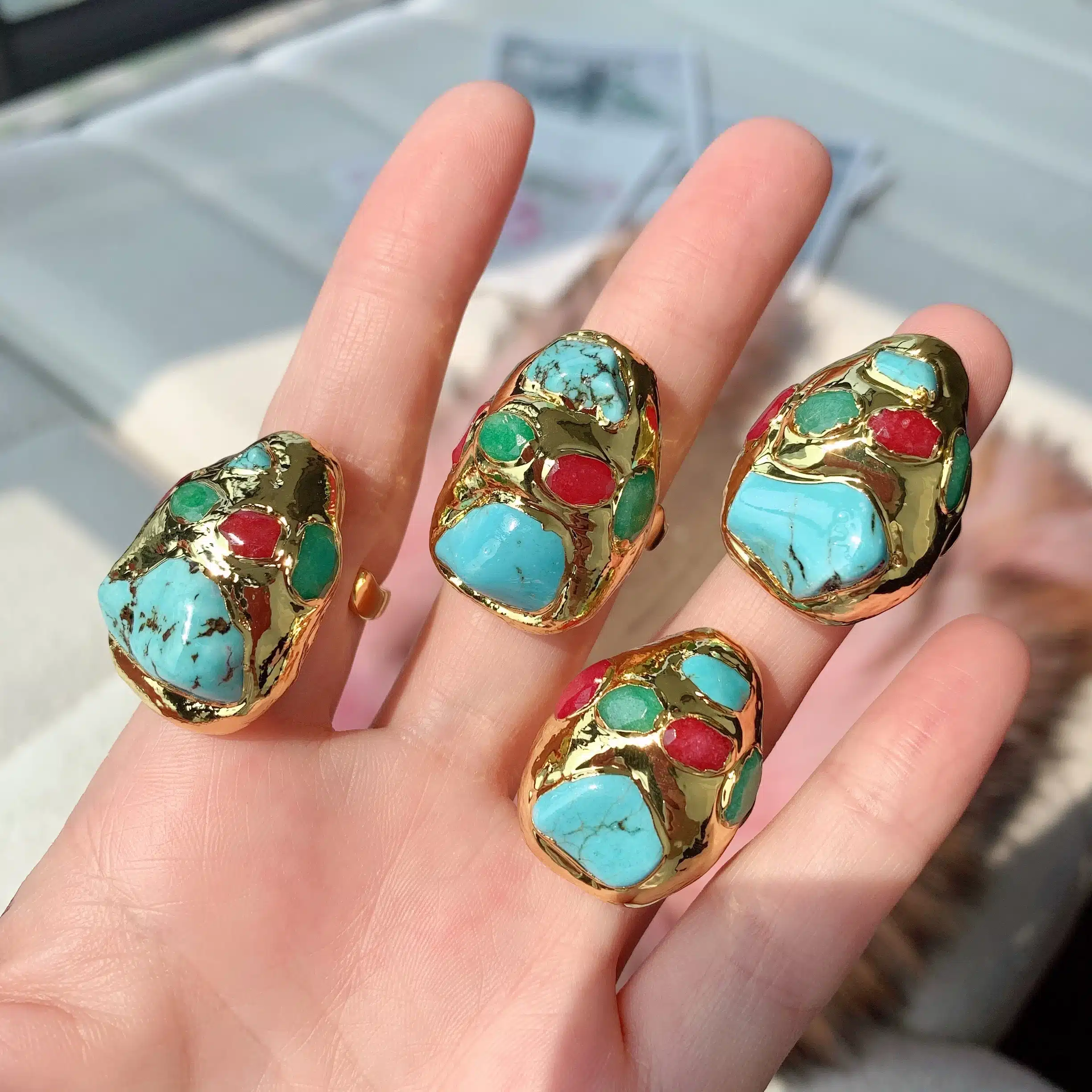 LS-L1838 New Multi Nature Stone Cuff Rings Bohemian Red Agate Green Aventurine Turquoise Rings for Gifts Gemstone Finger Ring