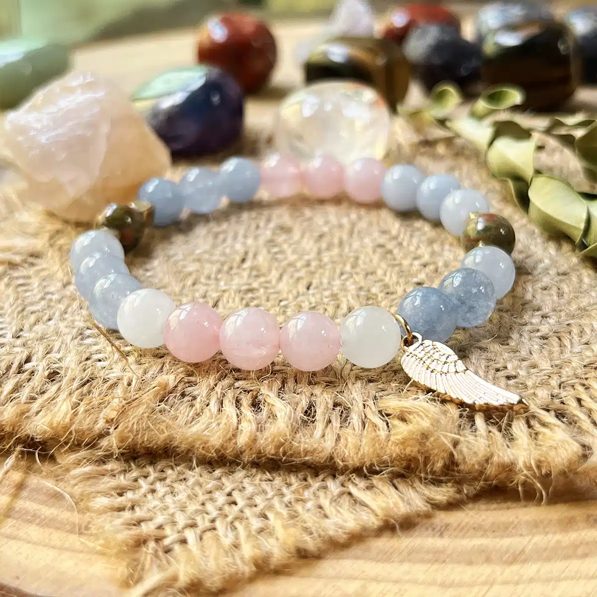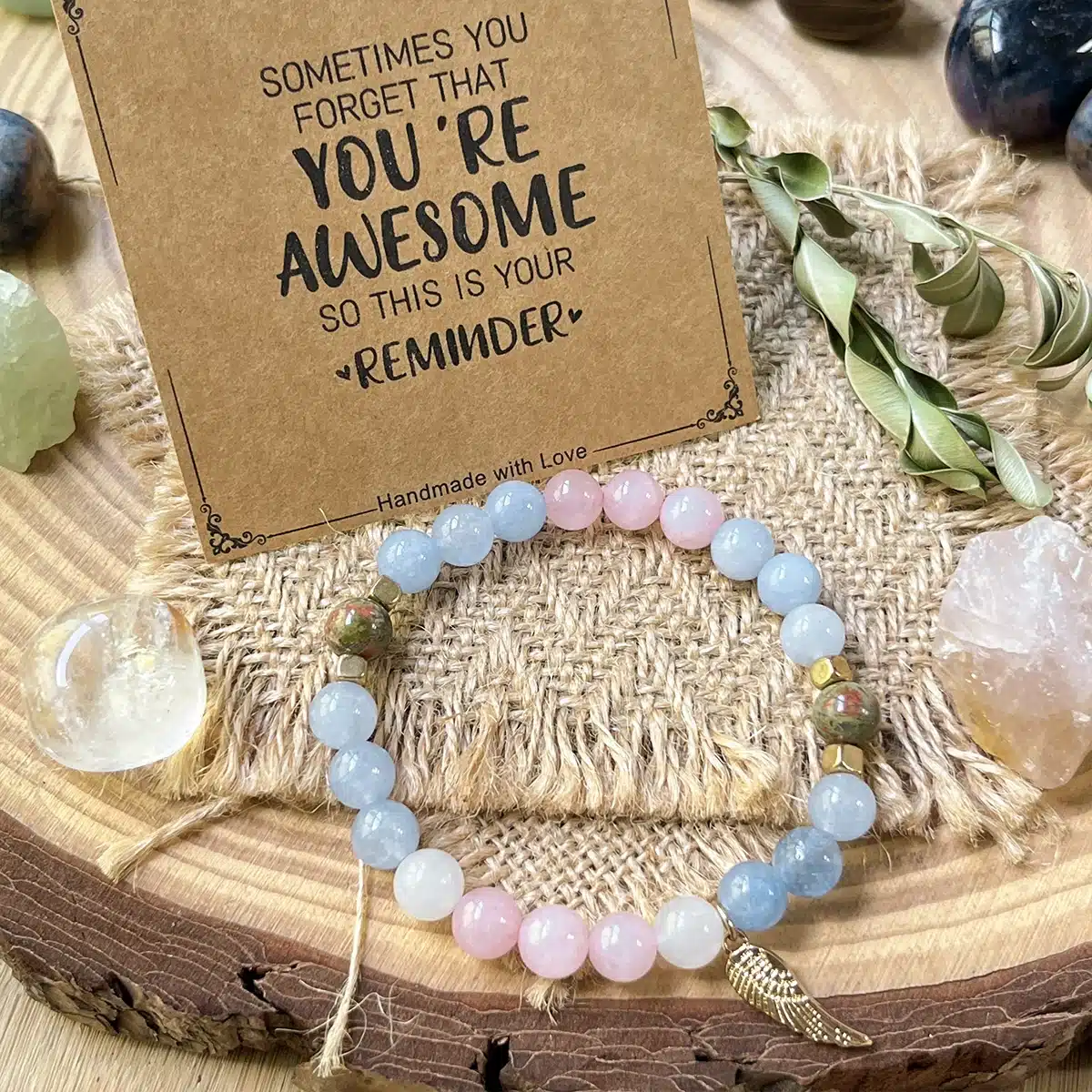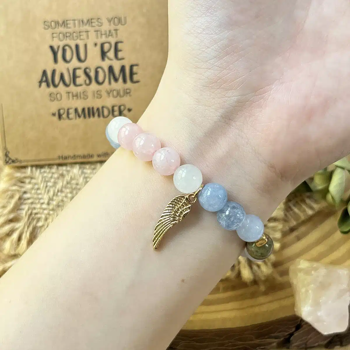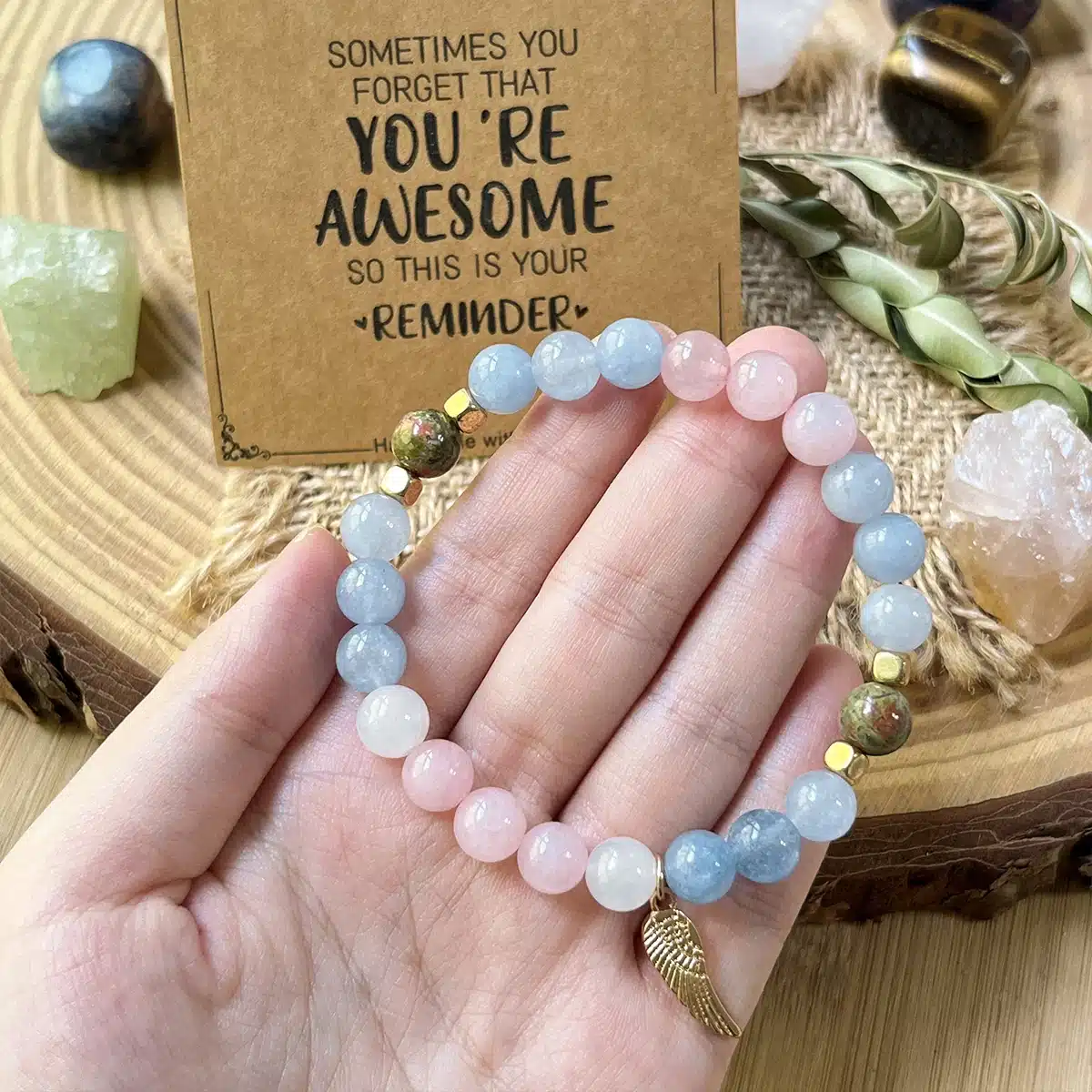 Be the first to review “Natural Aquamarine & Rose Quartz Bead Elegant Angel Wing Feather Pendant Bracelet Sentimental Memorial Jewelry” Cancel reply