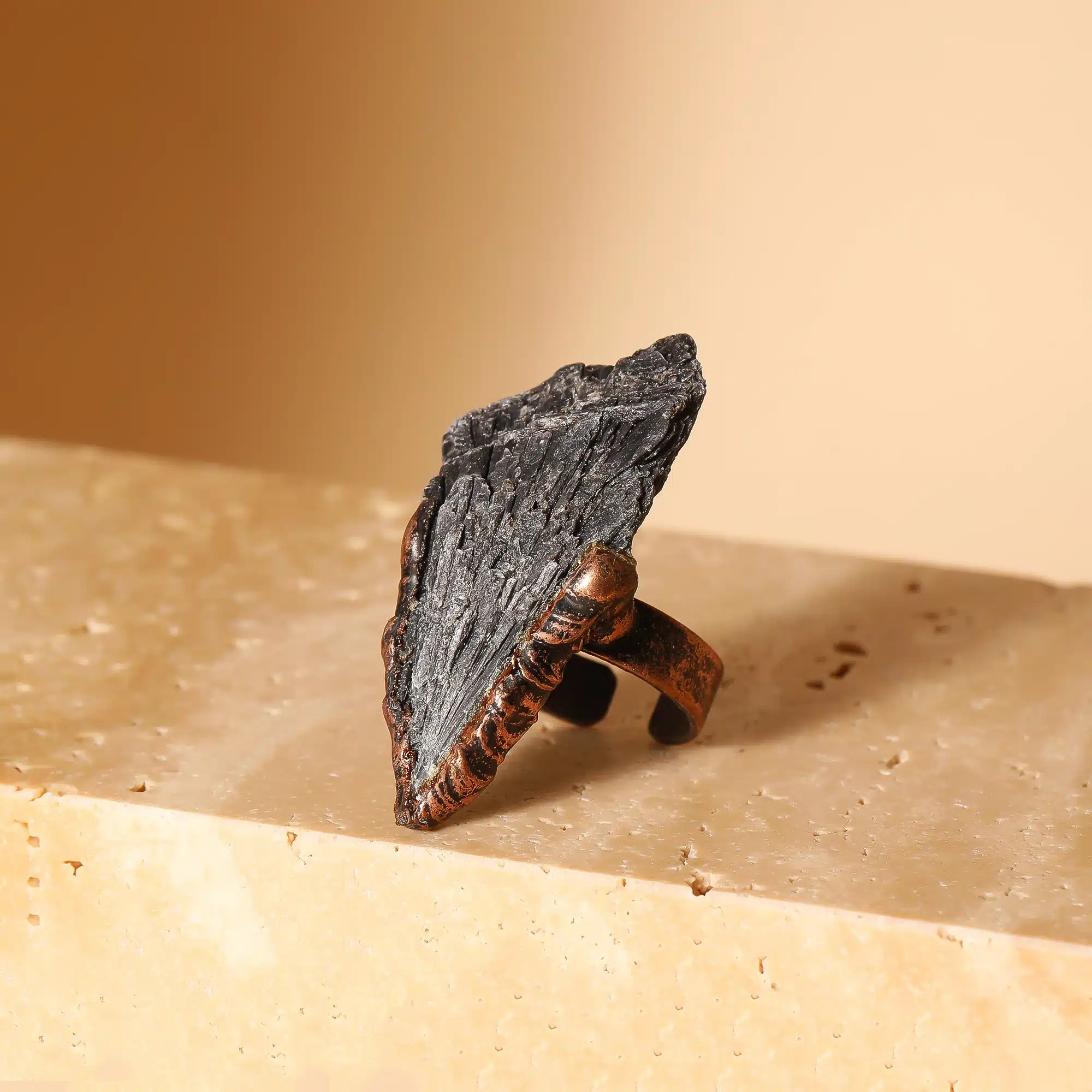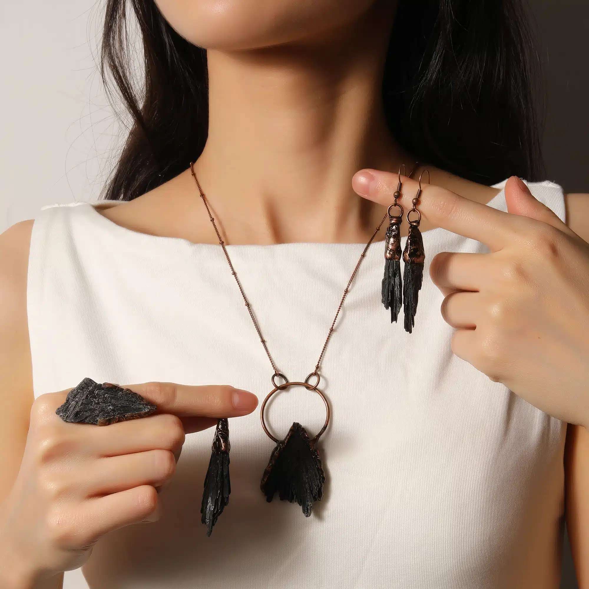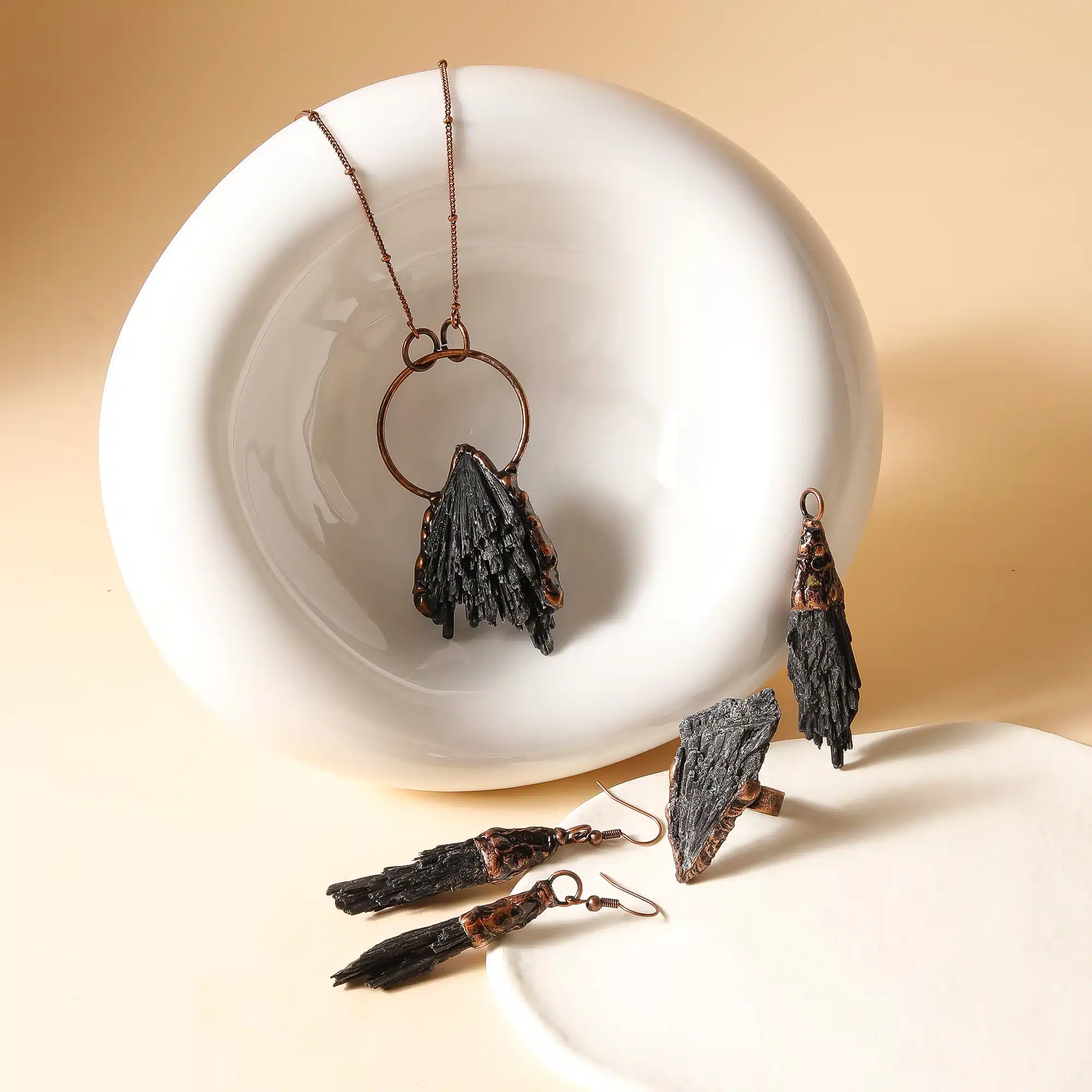 Natural Black Tourmaline Bronze Plating Jewelry Set Stylish Necklace Rings Earrings and Pendants for Women