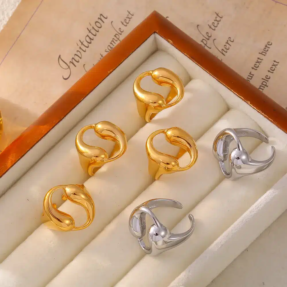 Be the first to review “New Arrival Fashion Unisex Stainless Steel 18K Gold Plated Anti Tarnish Jewelry Irregular Yin Yang Hollow Rings for Women” Cancel reply