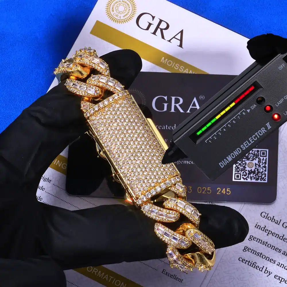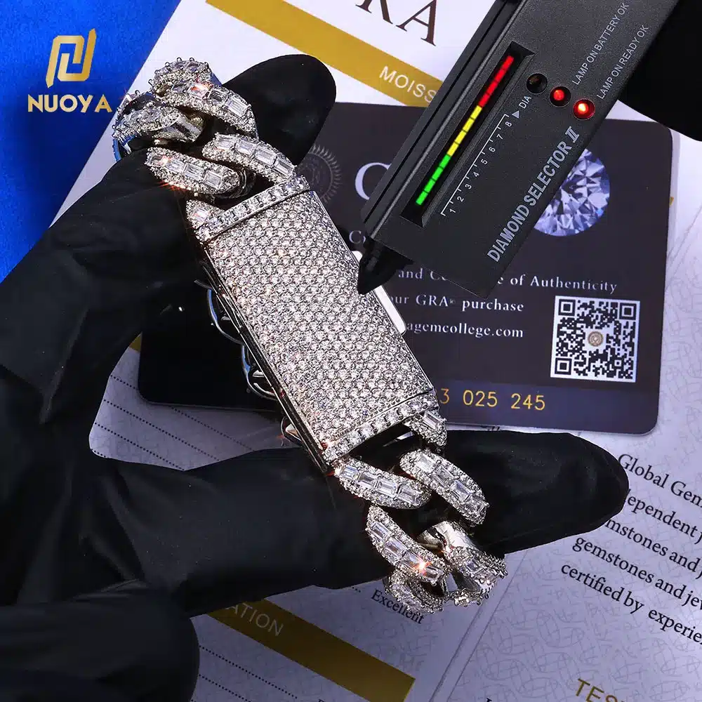 Be the first to review “NUOYA 18mm Heavy Duty Cuban Chain 925 Silver Bracelet Flip Buckle Iced VVS Moissanite Baguette Inlay Hip Hop Jewelry” Cancel reply