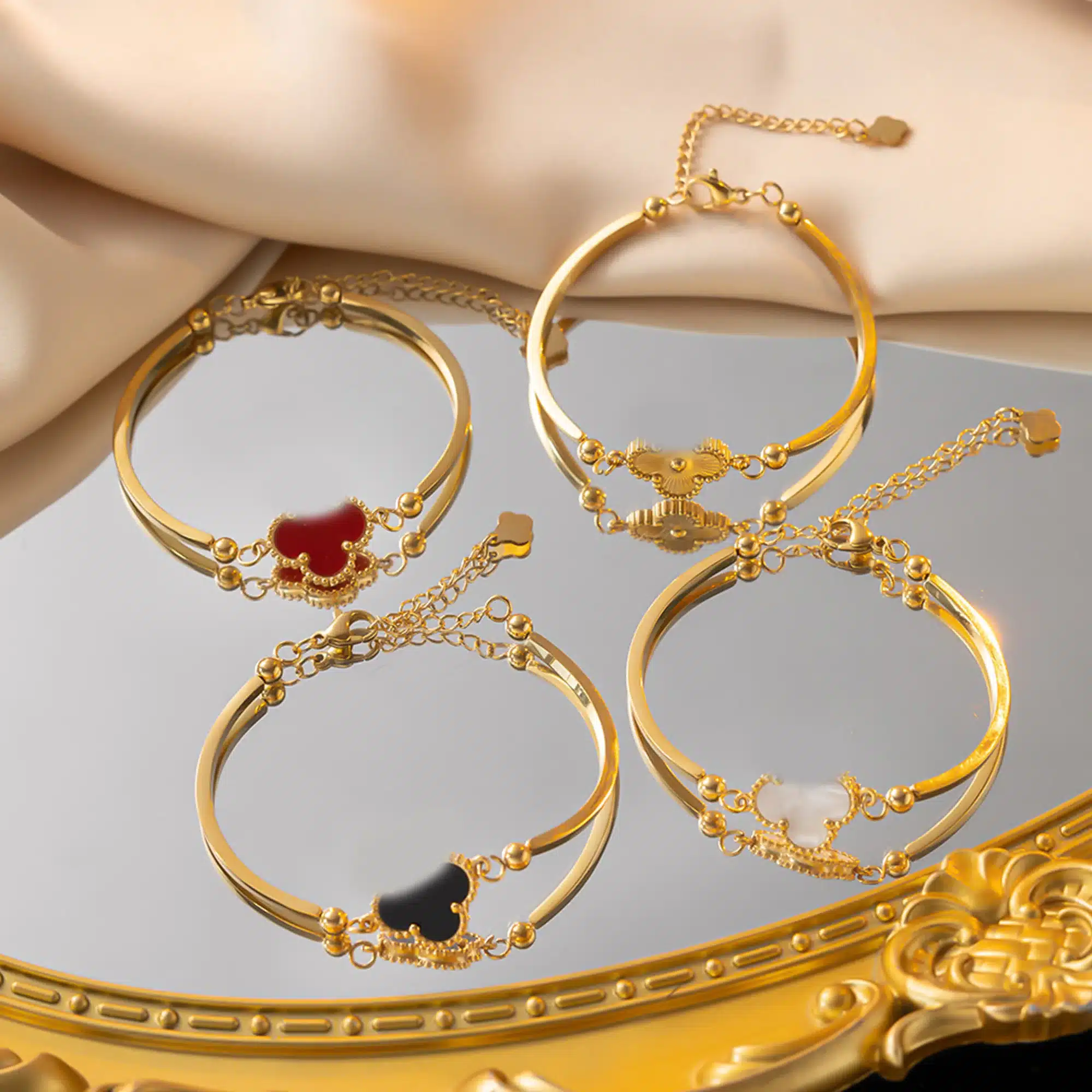 Popular Waterproof Black Red Clover Bangle 18K Gold Stainless Steel Gold Four Leaf Clover Bracelet Bangle