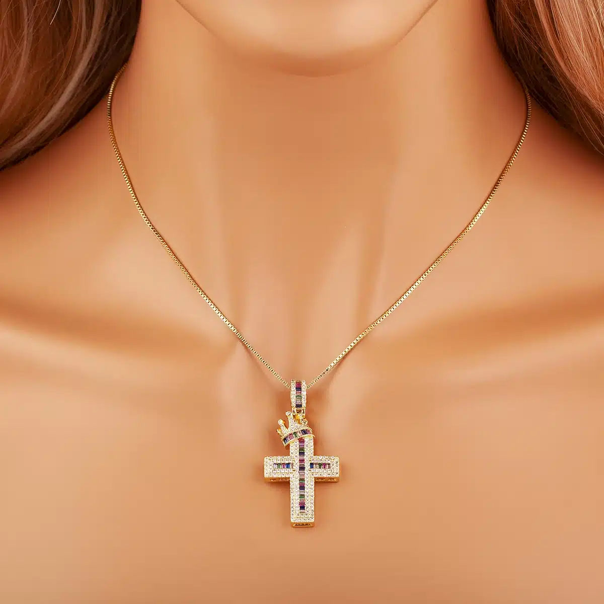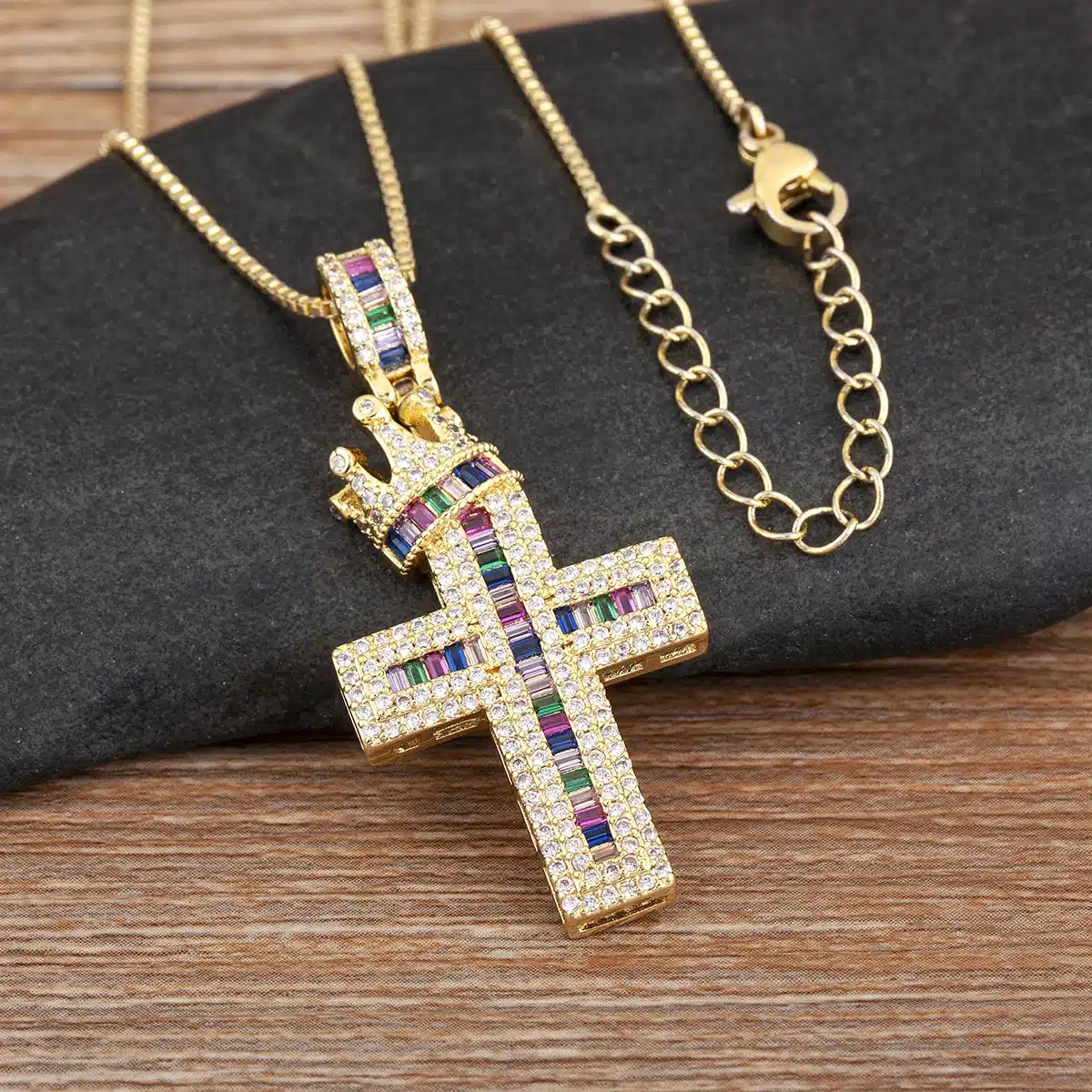 QIKU Light Luxury Crown Cross Shape Cubic Zirconia Copper Pendant Necklace Women Men Delicate Jewelry Birthday Party Charm Gift