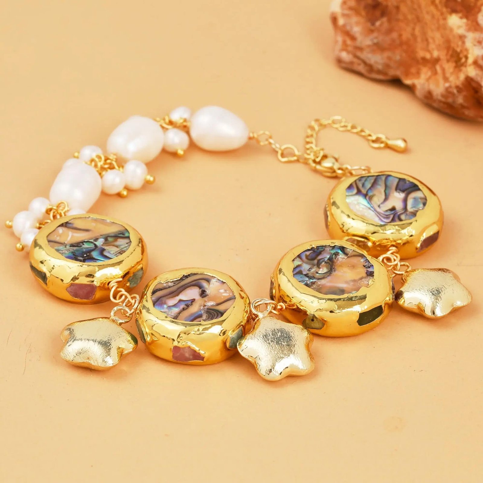 Round Shape Gold Plated Abalone Shell Beads With Natural White Pearl Hand Wrap Bracelets Jewelry for Women’s Party