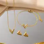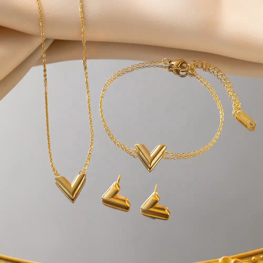 Be the first to review “Simple and Fashionable Gold Light Luxury V-Letter Necklace Non Fading Necklace Earrings Bracelet Three Piece Set for Women” Cancel reply