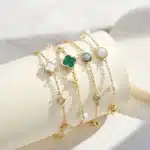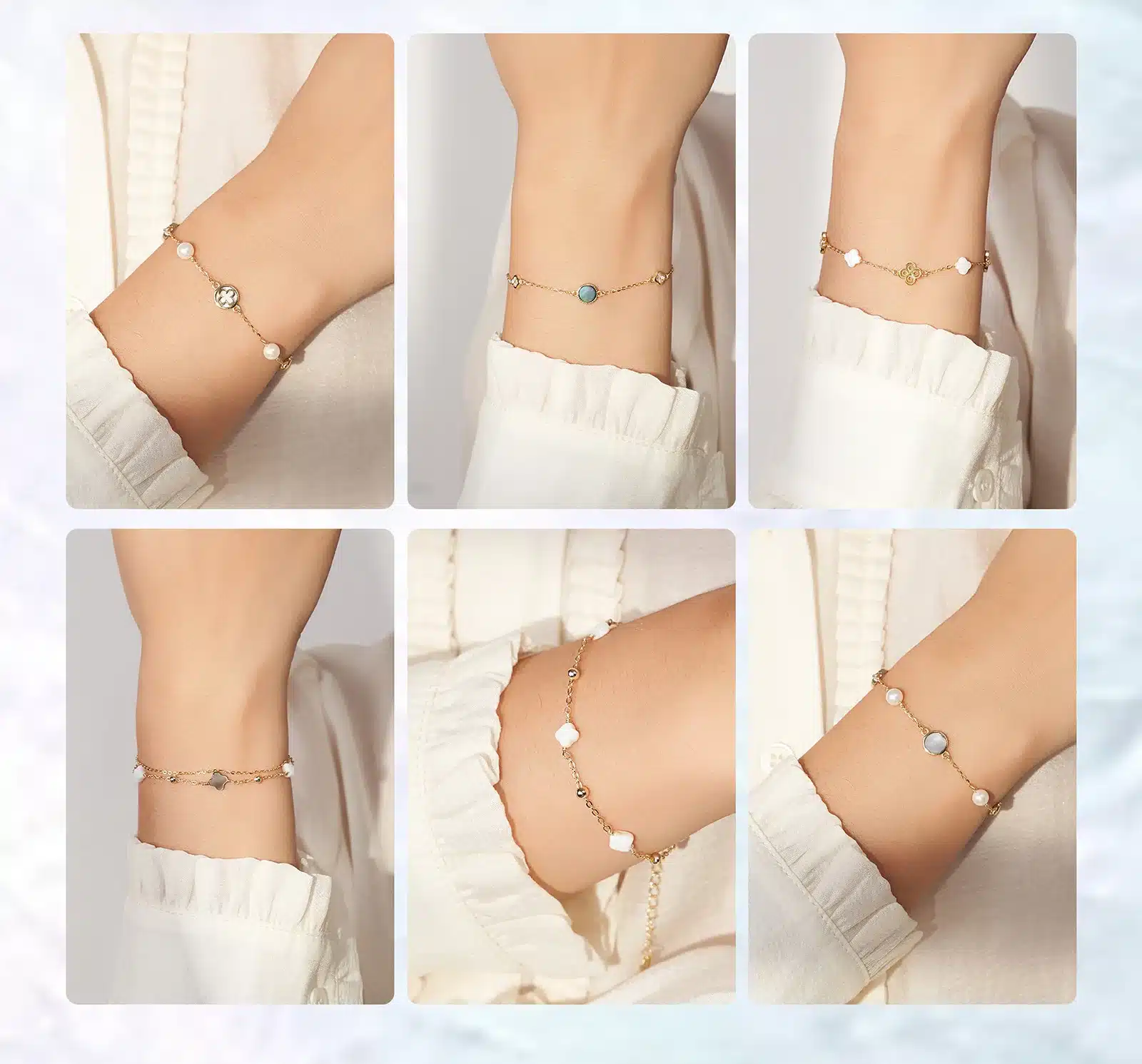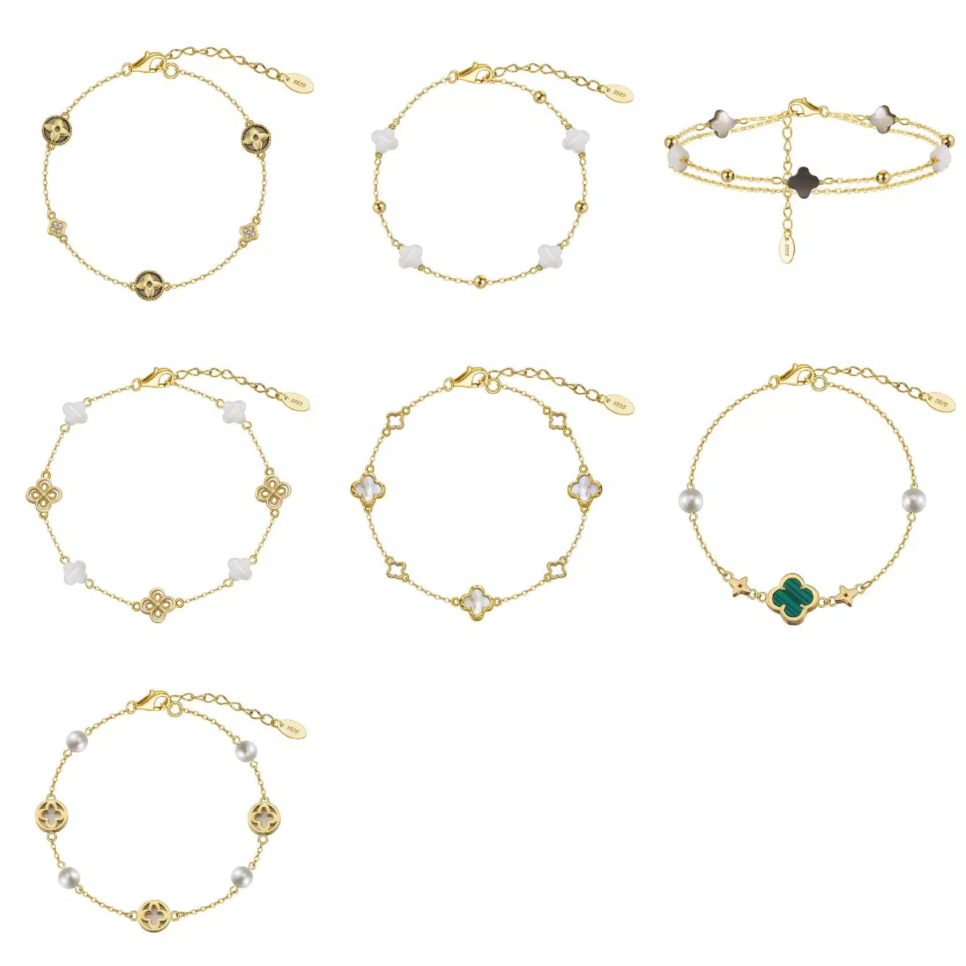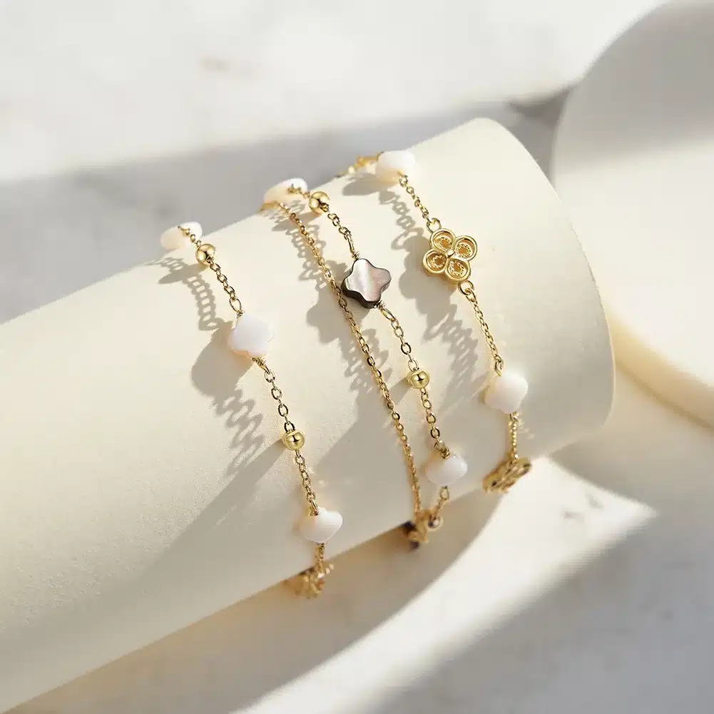 Key attributes Plating:Rhodium Plated, Rose Gold Plated Bracelets or Bangles Type:Charm Bracelets Shape:Four-leaf Clover Inlay technology:Micro insert Main Stone:Shell Jewelry