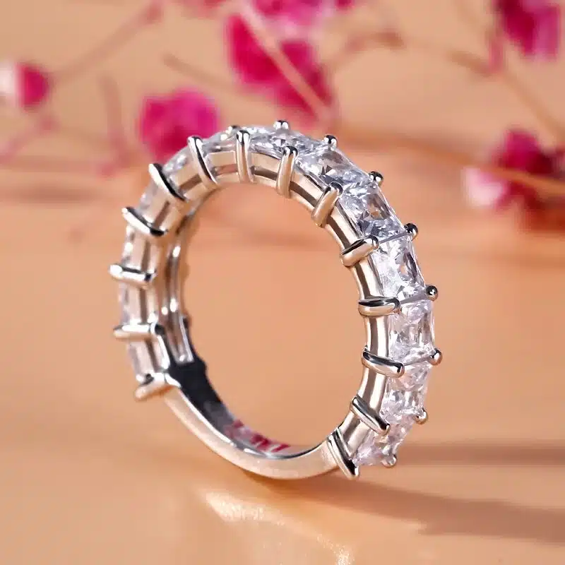 Key attributes Main Stone:Moissanite Plating:Rhodium Plated Rings Type:Gemstone Rings Inlay technology:Claw Setting Setting Type:Channel setting Style:Classic Occasion:Other, Anniversary, Engagement, Gift,