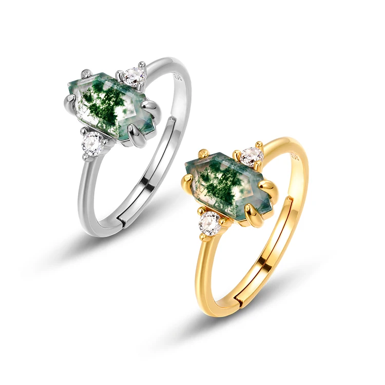 Wholesale 925 Silver Jewelry Retro Gemstone Ring Gold Plated Hexagon Shape Natural Green Moss Agate Ring