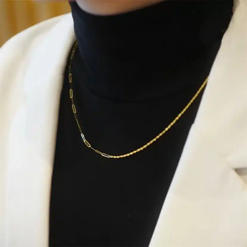 Key attributes Necklaces Type:Chains chain type:Paper clip chain Gender:Children’s, Men’s, Unisex, Women’s Jewelry Type:Necklaces Shape:Paper clip Jewelry Main Material:Gold Style:Trendy